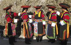 中青年妇女戴黑色织锦边毡帽或插花礼帽,也戴耳坠,耳坠主要是银质耳坠和串珠耳坠。银质耳坠有大耳坠、小耳坠之分。大耳坠有“上五下七”“上七下九”,即耳坠分上下两层,上有五穗或七穗,下有七穗或九穗。穿小领斜襟开衩袍衫,两袖套着由红、绿、粉红、黑、黄五色彩布做成的土语叫“绣苏”的花袖,袖口放约5寸宽的白色袖边,极富民族特色。长袍上面套有黑色、紫红色或其他颜色的坎肩,坎肩有镶边的,也有不镶边的;腰系自织的褐子腰带、棉线腰带以及彩带,彩带两头有刺绣或盘绣的花纹图案。腰带右前方挂着铜质或银质的土语叫“洛藏”的佩饰环,环上挂件有绣花手巾、铜铃铛、针扎及彩绸、毛巾等物。腰带左前方佩戴绣有各种图案的“钱褡子”。