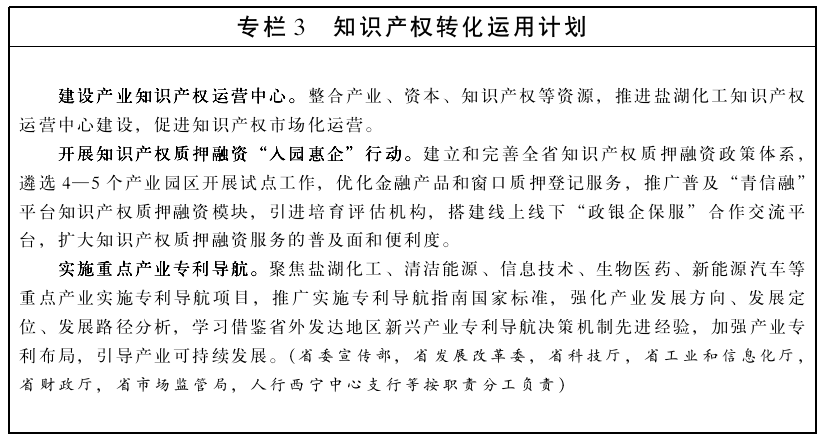 1.推进知识产权与产业融合发展。着力培育知识产权密集型产业,研究制定专利密集型产业培育目录,探索专利、商标、地理标志等多类型知识产权协同运用支撑产业创新发展机制,提高知识产权对经济发展、区域发展、产业发展的贡献度。围绕盐湖锂电、清洁能源等重点产业组织实施专利导航工程,为产业发展和技术创新提供支撑。支持高校和科研院所技术转移中心、知识产权运营中心等知识产权转移转化平台建设,鼓励向中小微企业转让、许可、作价入股专利技术,提高专利技术市场化运营能力,实现技术产业化。(省发展改革委,省教育厅,省科技厅,省工业和信息化厅,省市场监管局,省统计局等按职责分工负责)
