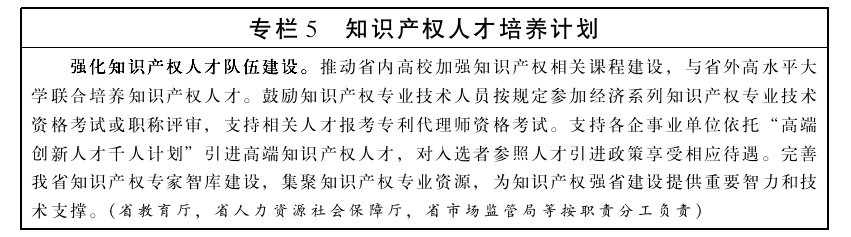 2.加强知识产权人才队伍建设。坚持党管人才原则,结合实际逐步建立健全我省知识产权人才政策体系。引进和培养高端知识产权复合型人才,加强对科技研发人员、知识产权管理人员、知识产权服务人员的多层次系统化培训,努力建设一支数量充足、结构合理、素质优良的人才队伍。加强知识产权教育培训,探索支持知识产权专业课程设置,鼓励有条件的高等院校开设知识产权选修课程。建立知识产权专家决策咨询团队,充实区域性、产业型的知识产权智库,为知识产权发展提供坚强的人才保障。(省教育厅,省人力资源和社会保障厅,省市场监管局等按职责分工负责)