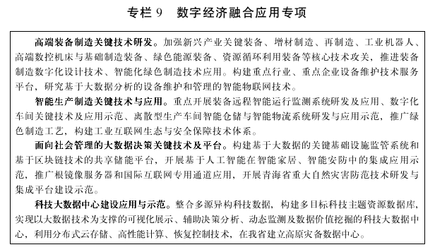 促进云计算、大数据、物联网、区块链、人工智能等新一代信息技术与实体经济深度融合应用,推动高端装备制造、智能生产制造、智慧城市建设、数字文化等领域发展。依托我省能源资源优势,布局发展大数据产业,面向全国提供数据存储、大数据分析计算、数据挖掘等“一站式”服务,加快我省工业互联网平台建设,助推“数字青海”建设。