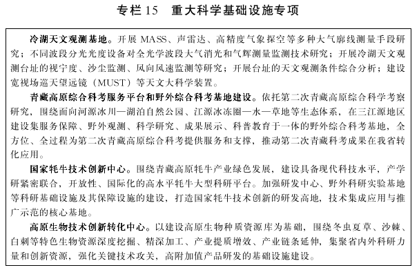 聚焦国家重大基础科学研究需求,发挥我省自然资源和应用场景优势,推进光学台址、射电多波段台址遴选和建设,打造世界级天文观测基地;继续推进青藏高原人类遗传资源样本库建设,为青藏高原人类资源的保护、管控和研究提供核心战略资源支持;推进三江源草地生态系统综合研究站、野外综合科考基地等科学基础设施建设;优化布局种质资源库、科学大数据中心等国家重大科学基础设施。