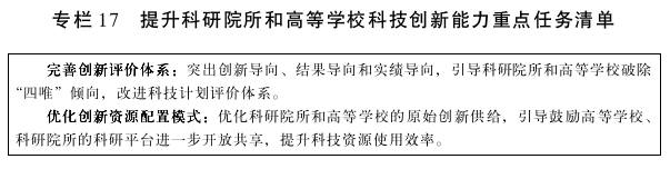 (二)提升科研院所和高等学校科技创新能力。突出创新导向、结果导向和实绩导向,改进科技计划评价体系,引导科研院所和高等学校破除“四唯”倾向;推动科研院所和高等学校科研人员坚持围绕“四个面向”重大要求,开展科学技术攻关,调整学科布局,提高人才与产业创新需求匹配度,优化科研院所和高等学校的原始创新供给;引导和鼓励高等学校、科研院所的重点实验室及工程(技术)研究中心等科研平台进一步开放共享,提升科技资源使用效率,为科学研究、技术进步和社会发展提供网络化、社会化、集约化的科技资源服务。
