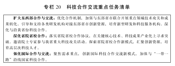 (一)深入开展东西部合作与交流。主动对接长江经济带发展、黄河流域生态保护和高质量发展、西部大开发形成新格局等国家重大战略,依托部省会商、对口支援、科技援青等合作机制,与东部省市联合开展重点领域技术攻关和成果转化,建立人才培养和科技园区共建新模式,推动青海特色产业、特色资源优势形成竞争新优势。探索“科研飞地”模式,鼓励、引导和支持各类科技研发机构主动对接东部省市创新资源,培育若干符合市场规律、服务创新链条的新型研发和科技服务机构。深化沿黄省份创新合作,助力黄河上游生态保护和兰西城市群高质量发展。