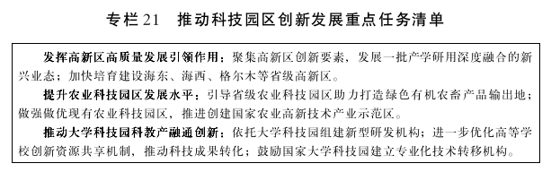 (二)提升农业科技园区发展水平。按照“一园一产业”原则,发挥农业科技园区在推进农牧业科技成果转化、农牧业新兴产业培育、现代农牧业管理模式创新等方面的示范引领作用,整合优化农牧业科技创新资源,助力打造绿色有机农畜产品输出地;整合现有资源,进一步做强做优现有农业科技园区,开展国家和省级农业科技园区提质增效行动,创新中国成立/中华人民共和国成立家农业高新技术产业示范区。
