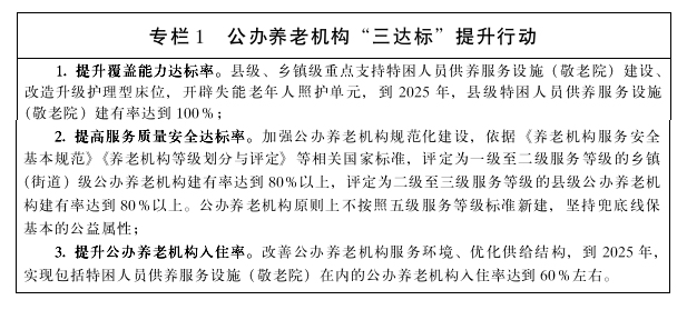 2.提升长期照护服务质量水平。加强公办养老机构建设,重点支持新建面向失能老年人的老年养护院和特困人员供养服务设施(敬老院),各地要根据特困人员等重点人群规模合理确定床位总量。加大存量公办养老服务设施改造,提升失能老年人照护服务,增设失智老年人护理专区,推动消防设施改造升级。加强区域性具备护理功能的公办养老机构建设,到2025年,县级行政区域特殊困难的失能老年人服务能力覆盖率达到100%。