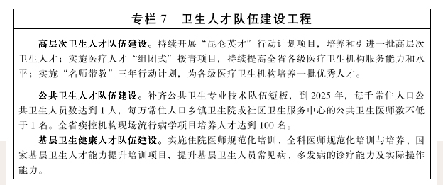 2.强化人才支撑体系。加强医教协同,推进高等院校医学教育与卫生健康行业需求紧密衔接,注重人才培养的针对性和实用性,大力培养医疗、公共卫生、中医(民族医)药专业人才以及卫生管理人才和急需紧缺人才,持续提升人才培养质量。加强全科医学教育,完善标准化、规范化的临床医学教育,加快健康服务业急需专业技术人员的规范化培养,尤其是加强农牧区在职卫生人员培训,提高现有卫生人员的业务素质,改善学历结构。加强乡村医生队伍建设,推动乡村医生队伍向执业(助理)医师转化,切实提高基层医疗卫生机构的服务能力。深化人事薪酬制度改革,合理制定并落实公立医院人员编制标准,建立动态核增机制,推动在医疗卫生机构落实“两个允许”要求。建立健全符合医疗卫生特点的人才评价机制。