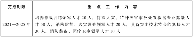 六、加强高素质人才队伍建设。立足国家综合性消防救援队伍正规划、专业化、职业化需求,实施人才强队战略,建设“一专多能、专常兼备”的消防救援人才队伍。按照专业岗位和职级梯次建立健全优秀年轻干部库,全面推进“蓝焰英才”工程。科学制定年度培训计划,分级分类举办干部岗位培训,联合各级党校建立领导干部联训机制,会同省内高校开展学历教育、委托培训、实习实践、毕业生输送等领域合作。支持鼓励指战员参加在职学历教育和社会技能培训鉴定,加大消防救援队伍高中级专业技术干部培育力度,2023年,全省中级专业技术职务干部编配率达到100%;2025年,全省高级专业技术职务干部编配率达到80%以上。