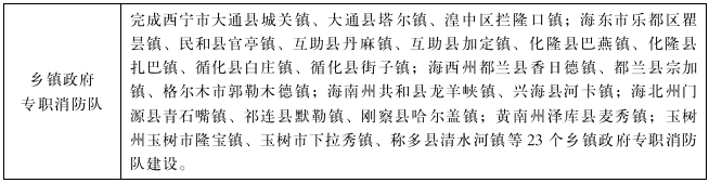 三、政府专职消防队伍建设工程。适应新型城镇化、城乡一体化快速发展,加大灭火和应急救援服务供给。在全省23个重点镇建设乡镇政府专职消防队,填补消防救援力量空白。开展政府专职消防队达标建设活动,乡镇政府专职消防队达到乡镇消防队国家标准。