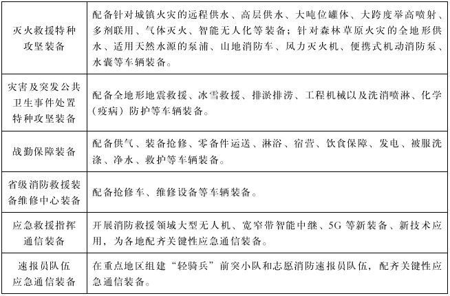 加强灭火攻坚装备配备。针对高层建筑、地下工程、大型综合体、石油化工等特殊场所火灾扑救需要,加强灭火攻坚装备建设,重点配备大跨度举高、高空破拆、高层供水、远程供水、高风压排烟等特种消防车辆和内攻搜救、便携破拆、消防机器人、远距侦检等攻坚装备,全面提升装备实战化配备水平。加强各类灾害事故专业装备配备。针对水旱、气象、地震、地质、森林草原火灾、重大生物等自然灾害救援和突发公共卫生事件处置等任务,加强复杂恶劣环境和极限条件下的应急救援专业装备建设,重点配备搜寻救护、挖掘清障、应急排涝、坝体消融、铲冰除雪、远程投送、洗消防疫等专业装备,加快形成适应“全灾种、全地形、全天候”条件下的遂行救援装备系列。