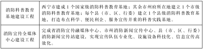 一、强化消防宣传工作基础建设。完善应急消防科普基地建设,打造布点科学、便民利企、服务宣传并重的科普实践基地。在西宁建设1个国家级消防科普教育基地,其余各市州、县(市、区、行委)分别建立市州、县级消防科普教育基地,每个县(市、区、行委)消防救援站达到对外开放标准,依托消防科普教育基地管理云平台,全面推广消防体验场馆网上预约。加强公共场所消防宣传阵地建设,每个市州建设1个消防文化主题公园,每个县(市、区、行委)设置1条消防宣传主题街道。各乡镇、街道、社区、大型商业综合体、中心学校设置消防常识普及宣传点。各市州每50万城镇人口配备1辆标准型以上级别的消防科普宣传车,达不到50万人口的市州至少配备1辆,鼓励县(区)配备简易型消防科普宣传车,定期开展普及性宣传活动,提升城乡居民消防安全意识和自防自救能力。