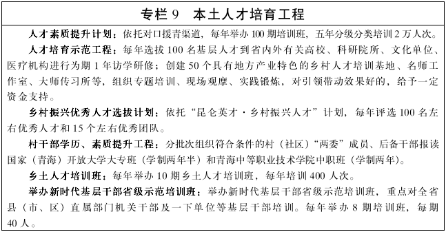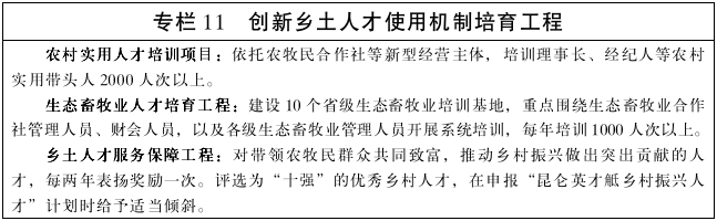 延续脱贫攻坚期间各项人才智力支持政策,落实《关于加快推进乡村人才振兴的意见》,建立健全引导各类人才服务乡村振兴长效机制。继续实施农村义务教育阶段教师特岗计划、中小学幼儿园教师国家级培训计划、银龄讲学计划、乡村教师生活补助政策,优先满足脱贫地区对高素质教师的补充需求,提高乡村教师队伍整体素质。继续实施省内高校招收农牧区和脱贫地区学生专项计划、重点高校定向招生专项计划、高校毕业生“三支一扶”计划中向重点帮扶县予以倾斜。继续实施全科医生特岗计划,探索实行卫生人才“县聘乡用”“乡聘村用”机制。继续支持脱贫家庭“两后生”接受职业教育,并按规定给予相应资助。建立农牧区实用人才挖掘和培育政策,培育一批农牧业职业经理人、乡村工匠、田秀才、土专家等乡土人才。