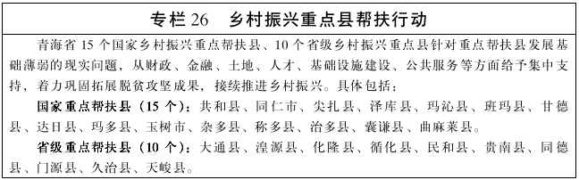 全面推进乡村振兴试点乡镇发展。从特色产业发展,基础设施完善,基本公共服务水平提升、生态环境、乡村治理等方面加大支持力度,着力巩固拓展脱贫攻坚成果,有序推进乡村振兴。通过先行先试,积极探索具有青海特色的乡村振兴方法路径。