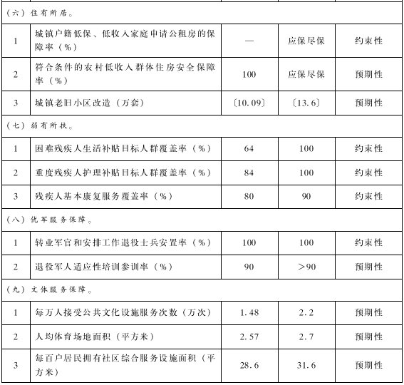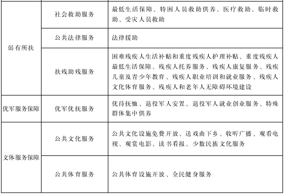 制定完善基本公共服务实施标准。围绕“幼有所育、学有所教、劳有所得、病有所医、老有所养、住有所居、弱有所扶,优军服务保障和文体服务保障”民生保障目标,对标国家基本公共服务标准,结合我省经济基础、资源禀赋、空间布局、人口结构和变动趋势、财政承受能力等因素,制定完善全省基本公共服务实施标准,科学合理确定服务对象、服务内容、服务标准、支出责任等,确保内容无缺项、人群全覆盖、标准不高攀、投入有保障、服务可持续。统筹经济社会发展和财政保障能力,建立实施标准动态调整机制。