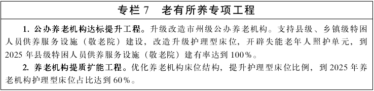 提升养老机构服务质量。开展养老机构提质增能行动,推进养老服务机构由数量规模型向质量效能型发展。完善养老服务质量标准,持续开展养老机构质量建设专项行动。支持有条件的地区开展“家庭照护床位”试点,利用社区养老服务设施提供助餐、助浴、助医、助急、助洁、康复、巡访关爱等服务。支持为高龄、失能、失智老年人提供长期照护服务的护理型养老机构发展。市场发育较为成熟的地区,公建养老服务设施优先采取民营方式,制定实施公建民营养老机构管理办法,逐步完善承接主体筛选机制。鼓励省内外优质养老运营机构跨地区延伸承接具备条件的公办机构运营管理。