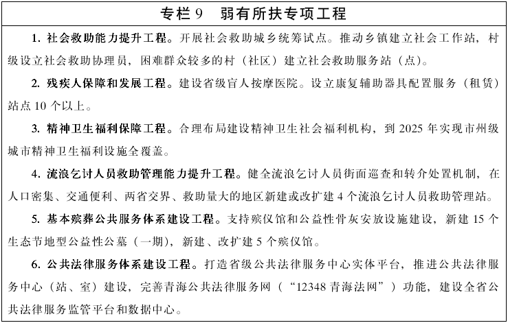 完善社会福利服务网络建设。推动精神障碍社区康复机构与社会福利机构、残疾人康复中心、残疾人托养机构、基层医疗卫生机构等服务对接、场地共用、技术共享。推进救助管理机构建设,建立返乡受助人员信息台账和易流浪走失人员信息库,分类衔接社会救助政策。颁布实施《青海省殡葬管理办法》,完善节地生态安葬奖补政策,修订惠民殡葬政策,以减免或补贴方式提供遗体接运、暂存、火化、骨灰存放等基本殡葬服务,并结合实际提标扩面。