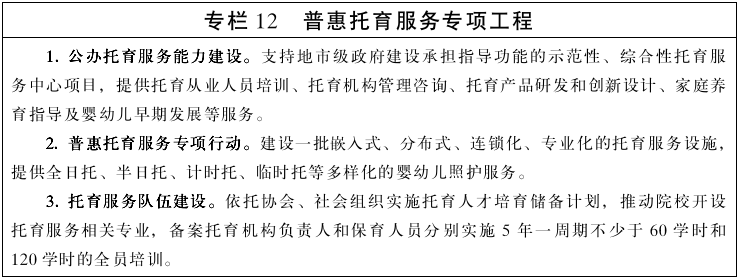 增加普惠性托育服务供给。加强公办托育服务机构建设,采取公建民营、购买服务等方式运营。实施普惠托育服务专项行动,支持社会力量发展社区托育服务设施和综合托育服务机构。鼓励公办机构发展普惠托育服务,依托社区、妇幼保健机构等建设托育服务设施。制定托育机构服务质量评估办法和评价指标。支持有条件的托育机构发展互联网直播互动式家庭育儿服务,鼓励开发婴幼儿养育课程、父母课堂等,推进智慧托育服务。