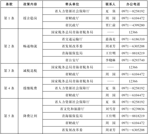 五、降费让利。延续实施阶段性降低失业保险、工伤保险费率政策1年,执行期限至2023年4月30日(牵头单位:省人力资源和社会保障厅)。扩大全省旅行社质保金保证保险覆盖面,对符合条件的旅行社维持80%的暂退比例,鼓励有条件的地方进一步提高暂退比例(牵头单位:省文化和旅游厅,配合单位:青海银保监局)。省服务业发展引导资金以股权投资方式支持的企业,免收疫情防控期间股权投资收益(牵头单位:省财政厅,配合单位:省发展改革委)。