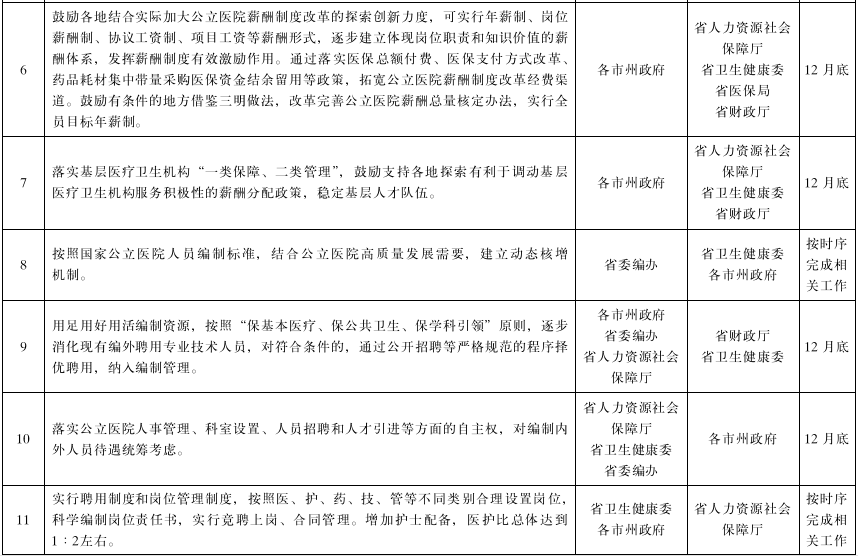 (八)深化人事薪酬制度改革。逐步消化现有编外聘用专业技术人员,对符合条件的,可通过公开招聘等严格规范的程序择优聘用,纳入编制管理。完善公立医院岗位设置管理,综合考虑编内、编外人员的实际情况,按照有关规定科学合理设置岗位。完善人才评价机制,制定卫生系列专业技术职务任职资格评价标准。结合实际,制定深化公立医院薪酬制度改革实施方案,落实“两个允许”,动态调整薪酬水平,落实医疗机构分配自主权,允许公立医院自主设立体现医疗行业特点、劳动特点和岗位价值的薪酬项目,人员支出占业务支出的比例更加科学合理,人员薪酬中固定部分占比达到60%。稳妥有序向医疗技术水平高、技术能力强、人事管理完善的三级医院下放高级职称评审权限。落实基层卫生事业单位“双定向”专业技术岗位比例,推进县域卫生专业人才统筹使用,加强专业技术人员考核。(省人力资源和社会保障厅、省委编办、省卫生健康委,各市州政府按职责分工负责)