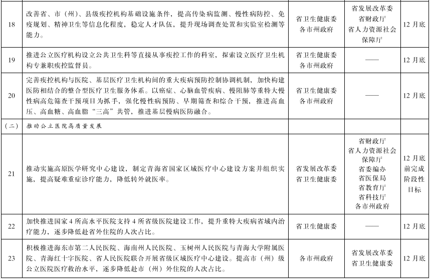 (七)开展公立医院高质量发展试点。落实《青海省推动公立医院高质量发展实施方案》,在5所省级医院(省人民医院、青海大学附属医院、青海红十字医院、省中医院、省妇女儿童医院)、5所市(州)级医院(西宁市第一人民医院、西宁市第二人民医院、海西州人民医院、海南州藏医院、黄南州人民医院)和3所县级医院(互助县人民医院、贵德县人民医院、都兰县人民医院)开展公立医院高质量发展工作试点。制定《青海省公立医院高质量发展促进行动(2022—2025年)》,明确各项重点任务的时间表、路线图和阶段目标,推动实现“三转变三提高”。开展公立医院高质量发展监测督导评价工作。健全公立医院运营管理体系,推动实施优化资源配置、提高医疗质量安全的业务与财务融合措施。(各市州政府,省卫生健康委、省财政厅、省人力资源和社会保障厅、省医保局、省发展改革委按职责分工负责)