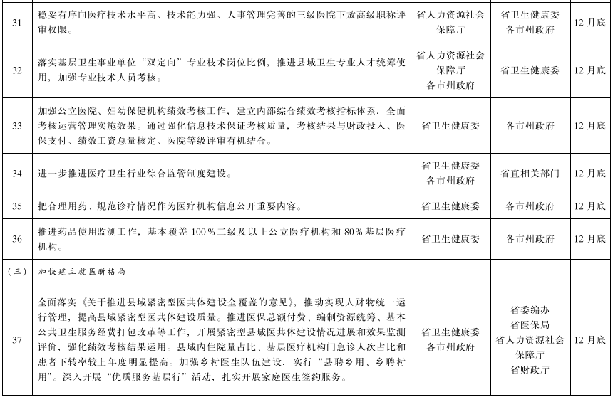 (二十二)强化责任落实。各地区要采取有力措施统筹推动各项工作,细化改革任务,明确目标责任,确保各项任务落地见效。省直相关部门要密切协作,加强“五医”政策统筹协调和综合配套,细化完善措施,加强对基层的指导,推进改革系统集成。各级医改领导小组秘书处要切实履行职责,强化沟通协调,定期开展工作调度,对措施落实不到位、进度明显滞后的,采取通报、督办、约谈等方式,督促任务落实。加强医改监测,强化对数据的分析评估,为持续推进改革提供决策依据。(各市州政府,省直相关部门按职责分工负责)