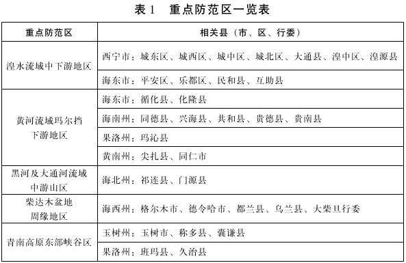 (二)重点防范区域。包括全省33个地质灾害高易发县(市、区、行委)。湟水流域中下游地区,地质环境条件复杂,黄土泥岩广泛分布,人口和设施稠密,人类工程活动逐年增加,加之近年来极端降雨天气增多,全省每年近65%的突发性地质灾害灾(险)情发生于该区域,是全省地质灾害防治形势最严峻的地区。特别是西宁市大通县、湟中区近年来切坡建房取土等工程活动诱发崩塌、滑坡事件频发。黄河流域玛尔挡下游地区,受黄河及其支流侵蚀下切导致高陡土质斜坡、深切沟谷等十分发育,加之工程活动相对频繁、极端强降雨较多等因素影响,地质灾害多发、频发,全省每年近20%的突发性地质灾害灾(险)情发生于该区域。黑河及大通河流域中游山区,近年来地震频发,寒冻风化作用强烈,山高沟深,地形切割强烈,松散物源较多,多年冻土发育,泥石流、崩塌、滑坡等地质灾害多发。柴达木盆地周缘地区,受构造、干旱等影响,岩土体较破碎,地形坡降大,松散固体物源丰富,便于水流汇集和快速冲刷,加之植被稀疏,在强降雨情况下泥石流灾害易发。青南高原东部峡谷区,新构造活动强烈,地震多发,岩土体较破碎,多年冻土发育且易退化,长江、澜沧江水系侵蚀强烈,地形高差大,降雨丰富,崩塌、滑坡、泥石流等地质灾害较易发。