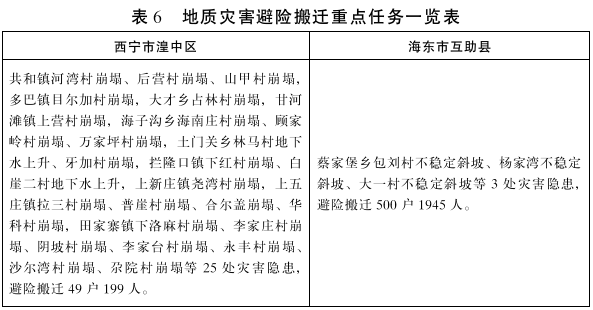 (四)开展避险搬迁,消除灾害隐患。各地要在充分尊重群众意愿的前提下,深入推进地质灾害避险搬迁工作。落实好2022年省级财政安排的西宁市湟中区49户199人和世界杯哪里下赌注互助县500户1945人的避险搬迁任务。
