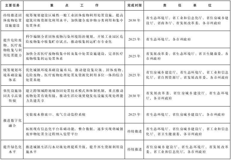 (五)统筹规划环境基础设施体系。科学编制全省固体废物污染环境防治规划,突出规划先行,按照绿色低碳、集约高效、循环发展的原则,充分衔接国土空间规划、生态环境保护规划以及城市基础设施建设规划,在具备条件的城市,优化城镇环境基础设施布局,加快环境基础设施项目建设。推动建设集垃圾、固体废物、危险废物、医疗废物处理处置及资源化利用多位一体的综合处置基地,依托现有产业园区,推进再生资源加工利用基地建设,加强基地内部产业循环链接,促进各类处理设施工艺设备共用、资源能源共享、环境污染共治、责任风险共担,实现资源合理利用,污染物有效处置,环境风险可防可控。