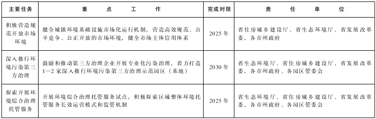 (十一)探索开展环境综合治理托管服务。引进大型环保集团或具有专业能力的环境污染治理企业,按照统筹规划建设、系统协同运营、多领域专业化、符合当地实际的原则,对区域污水、垃圾、固体废物、危险废物、医疗废物处理处置提供环境治理综合托管服务。湟水河流域所在城镇开展环境综合治理托管服务试点,积极探索区域整体环境托管服务长效运营模式和监管机制。