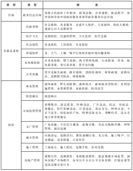 (2)涉及经济社会发展、经济调节、市场监管、社会管理、城市建设、城市管理、房地产管理、公共服务、公共卫生、生态环境、交通运输、劳动保障、价格争议、消费维权等方面的咨询、非紧急求助、投诉、举报和意见建议。