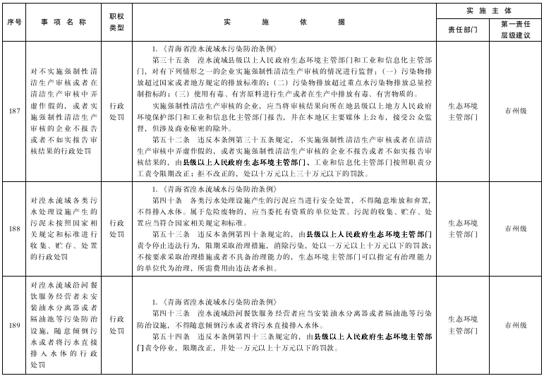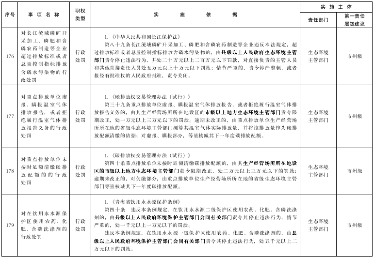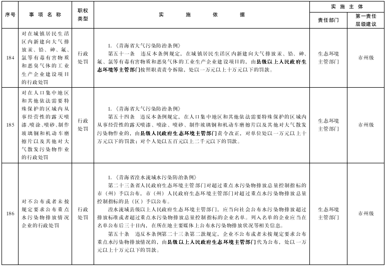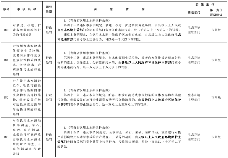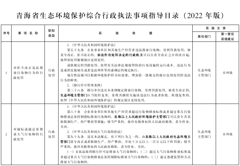 为进一步加强全省生态环境保护综合行政执法,结合我省生态环境保护综合行政执法改革和法律规章“立改废释”情况,在《青海省生态环境保护综合行政执法事项指导目录(2020年版)》的基础上,制定《青海省生态环境保护综合行政执法事项指导目录(2022年版)》(以下简称《指导目录》),现将有关事项通知如下: