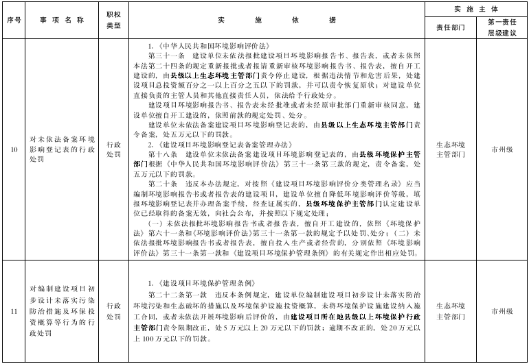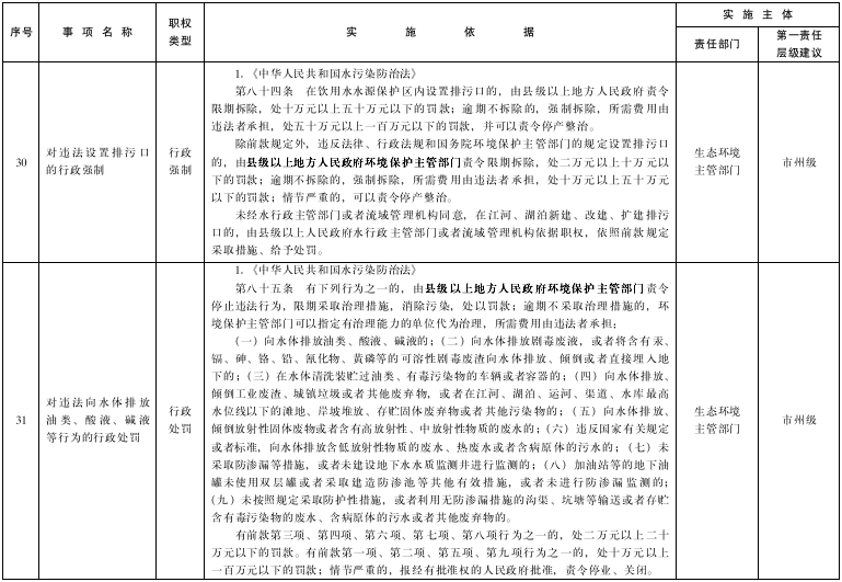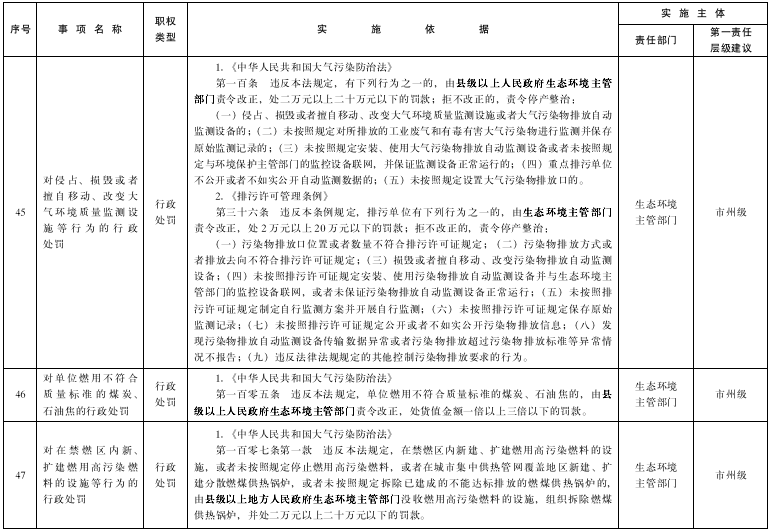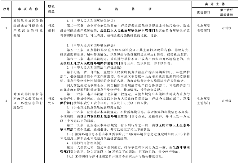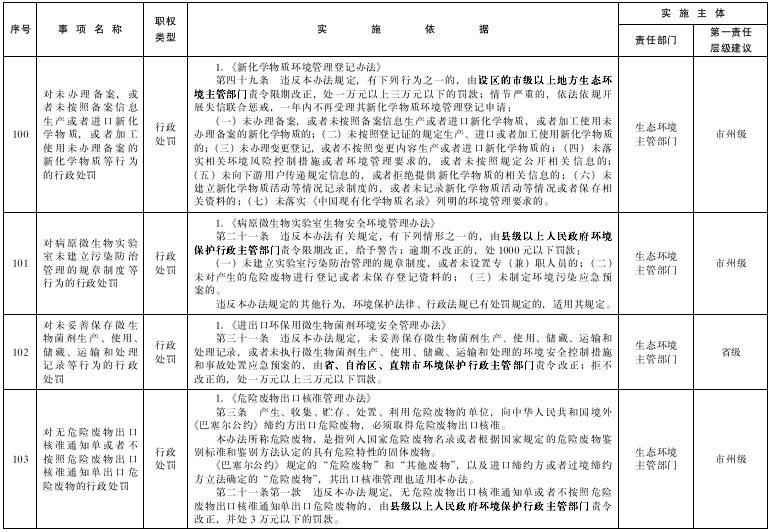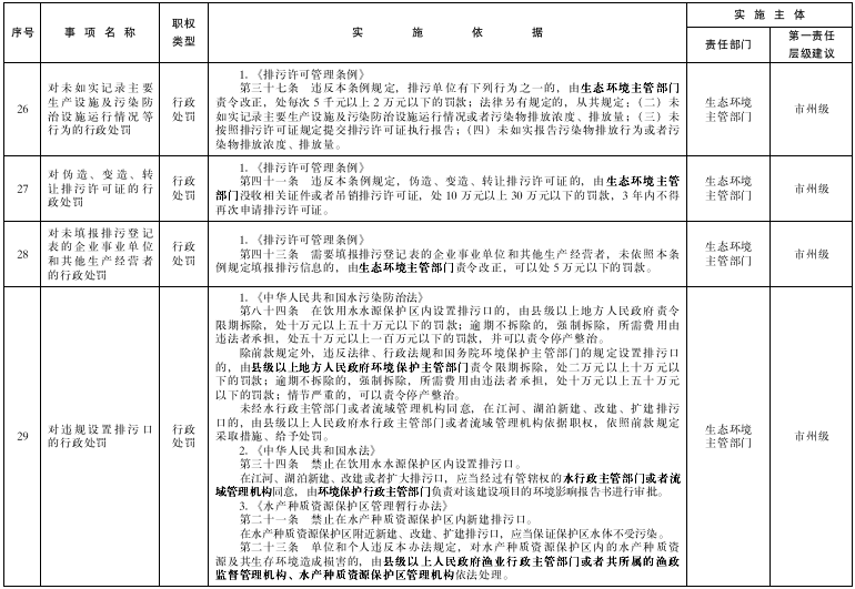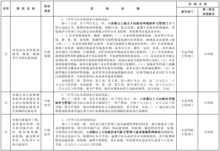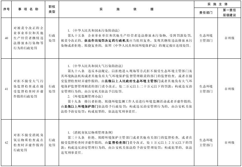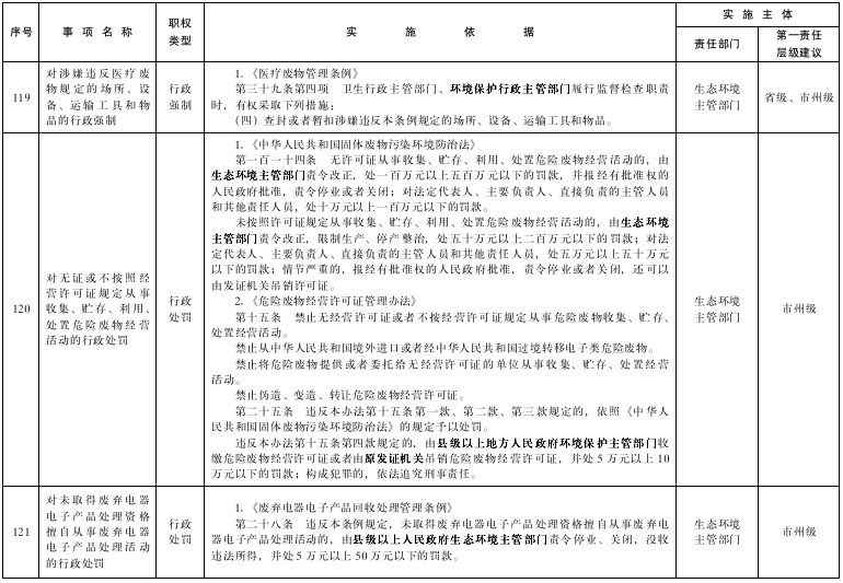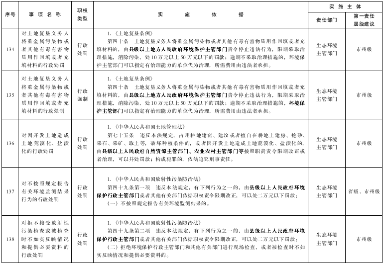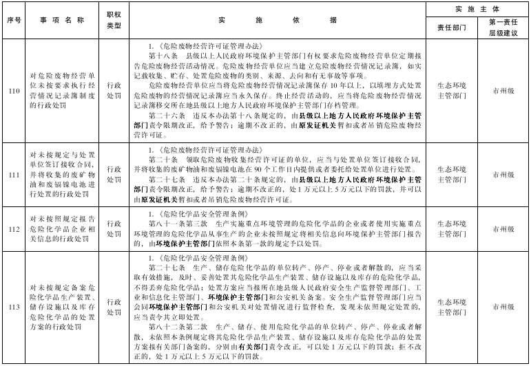 各地区各部门要按照党中央、国务院决策部署和省委、省政府工作要求,切实加强组织领导,对列入《指导目录》的行政执法事项,始终按照减少执法层级、推动执法力量下沉的要求,明晰第一责任,规范执法流程。要扎实推进生态环境保护综合行政执法改革,全面落实行政执法责任制,形成可量化的综合行政执法履职评估办法,作为统筹使用和优化配置编制资源的重要依据。省生态环境厅要加强对地方生态环境部门的业务指导,推动完善执法程序、严格执法责任、加强执法监督,不断优化生态环境执法方式,提高执法效能和依法行政水平。