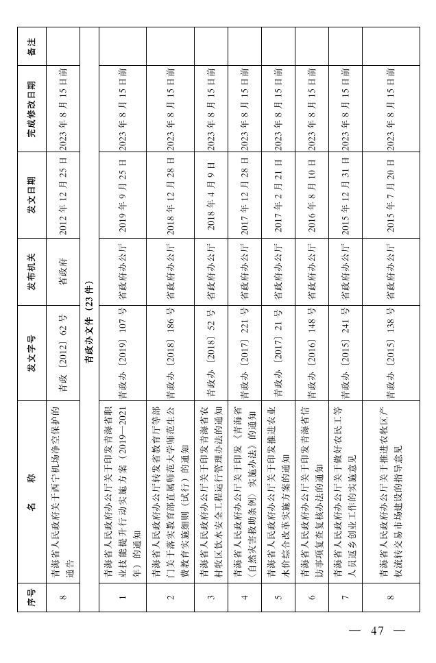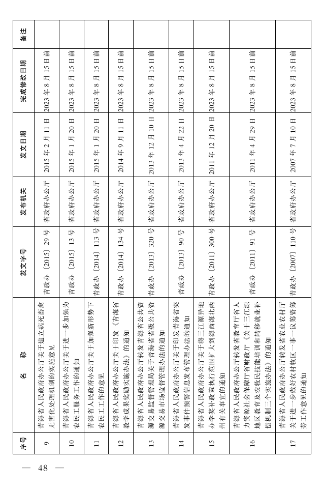 二、对部分内容与现行法律、法规和政策规定相抵触的31件行政规范性文件(目录见附件2)予以修改,修改前继续有效。由各责任单位牵头负责于本通知印发之日起6个月内完成修改工作,并按行政规范性文件制定程序报省政府审定后重新公布实施。
