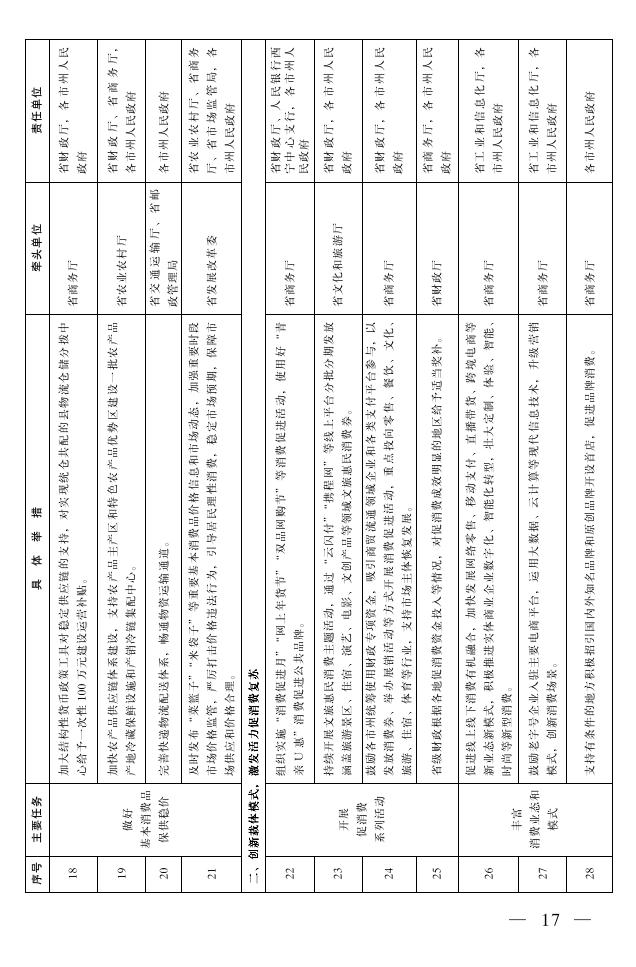 (二十)加强组织领导。省发展改革委、省商务厅、省市场监管局等有关部门要充分发挥省完善促进消费体制机制部门联席会议制度作用,健全纵向联动、横向协同、行业协作的工作机制,加强统筹调度,持续跟踪问效,切实推动各项任务措施落地见效。各市州人民政府要落实属地责任,落实落细释放消费潜力促进消费政策举措,放大政策集成效应,着力稳定经济基本盘。