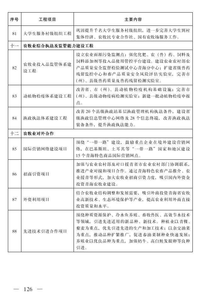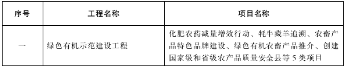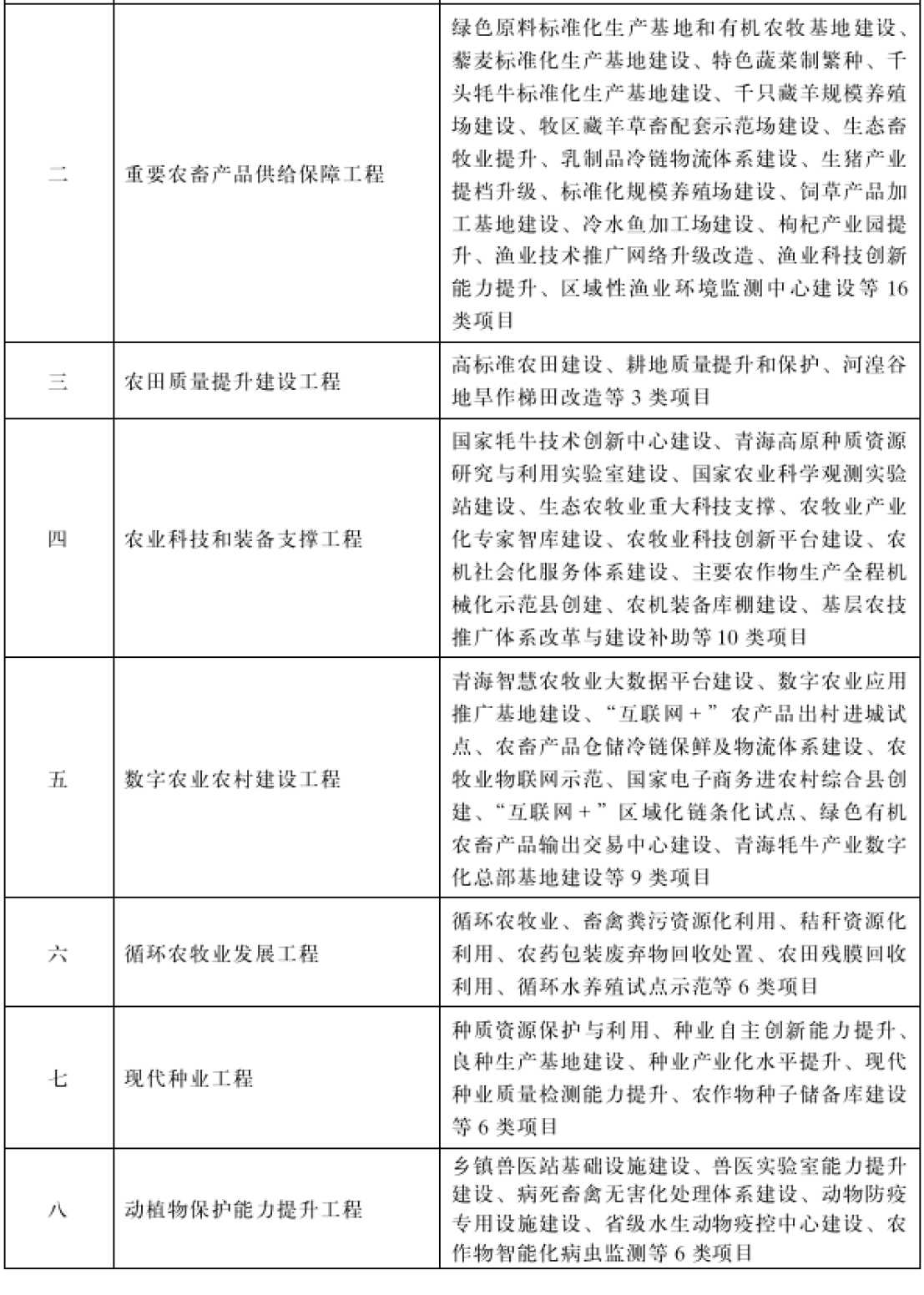 重点工程项目包括绿色有机示范建设、重要农畜产品供给保障、农田质量提升、农业科技和装备支撑、数字农业农村建设、循环农牧业发展、现代种业、动植物保护能力提升、乡村产业振兴、农业农村人才培养、农牧业综合执法及监管能力建设和农牧业对外合作等12项重大工程88类项目(表9—1)。
