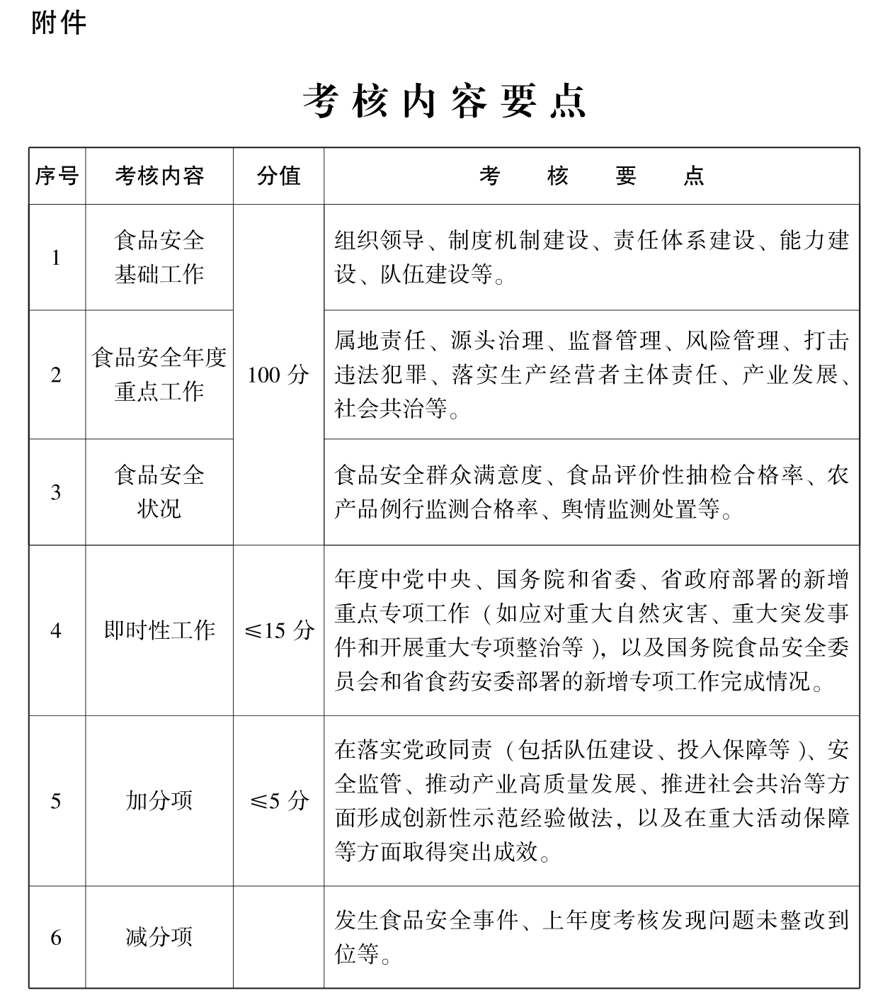 第五条 ?重点考核年度食品安全工作组织领导、能力建设、制度建设、队伍建设、推动创新、重点工作落实、食品安全状况等方面的工作部署、保障措施和推动落实情况。设置即时性工作评价和加减分项,根据年度重点工作安排动态调整,切实减轻基层负担。