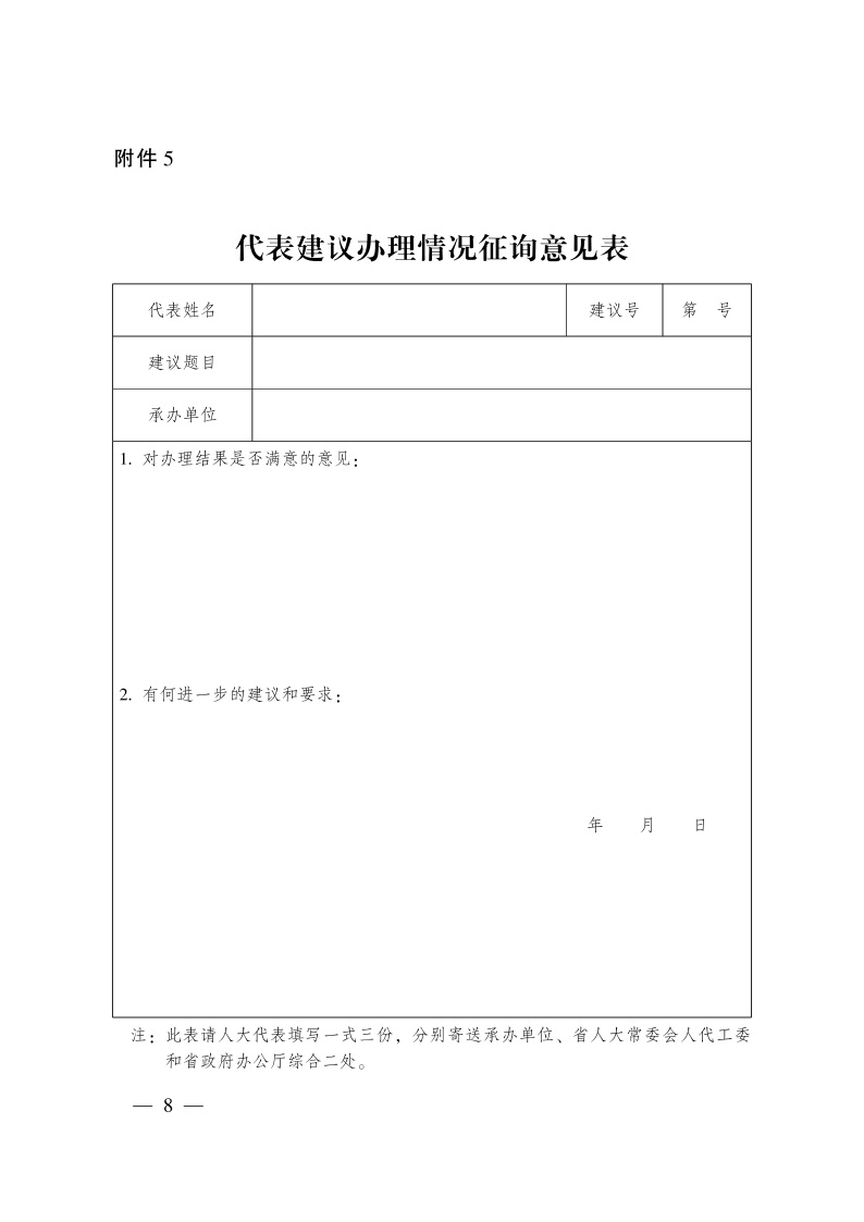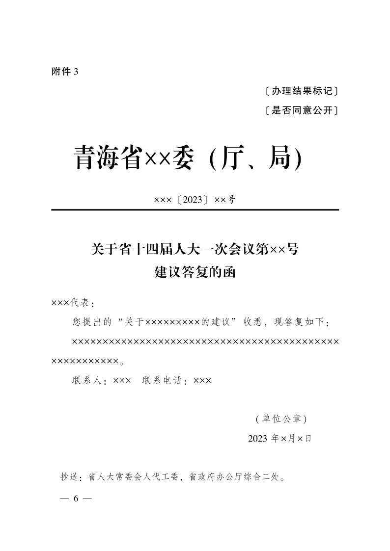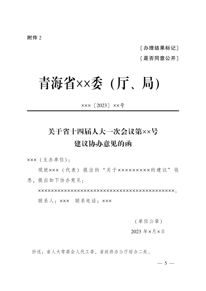 三、各承办单位于8月31日前全部办结承办的建议提案(复文格式、征询意见表详见附件2、3、4、5、6),并于9月30日前将年度工作总结(含电子版)函报省政府办公厅,分别抄送省人大常委会办公厅、省政协办公厅。