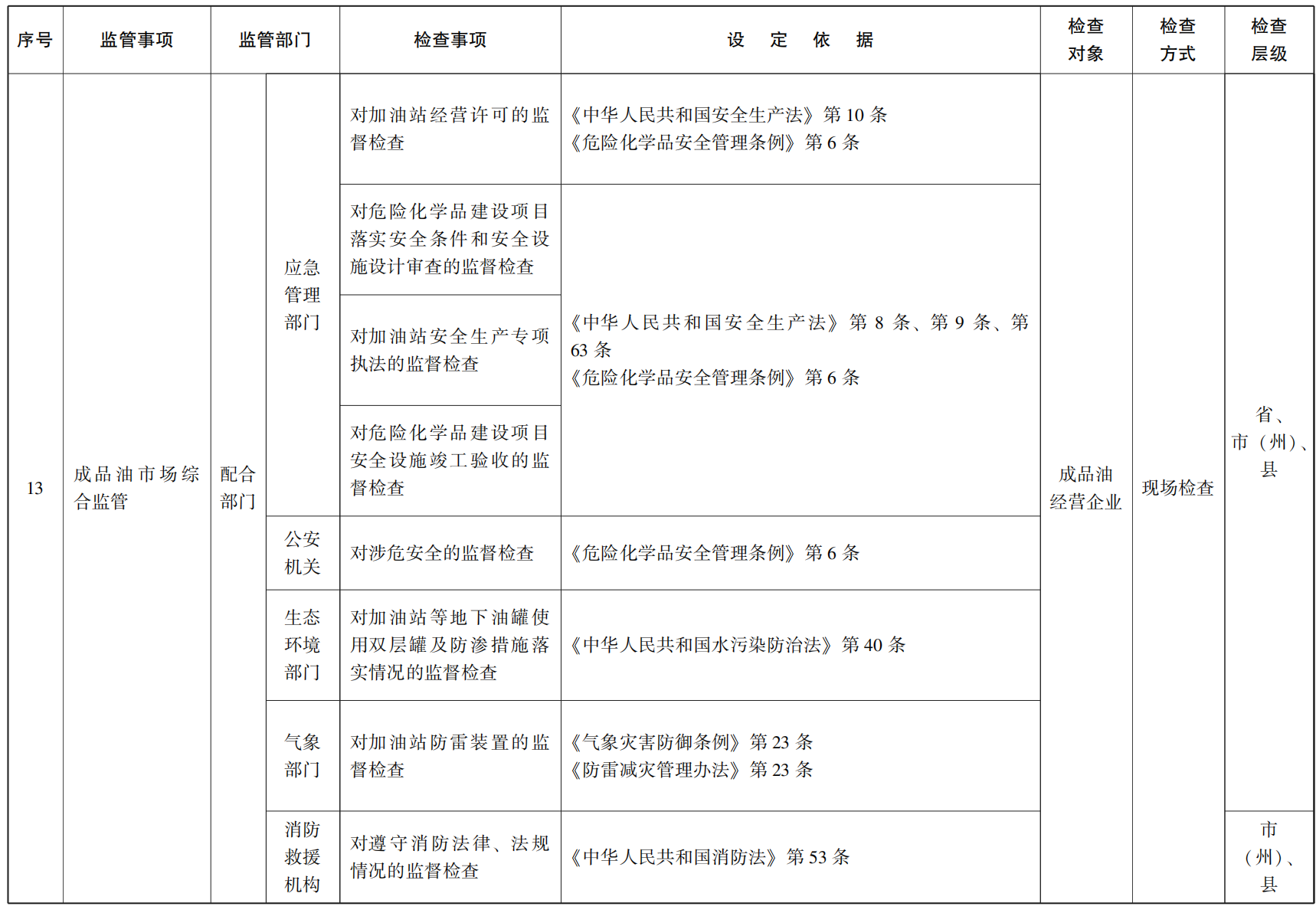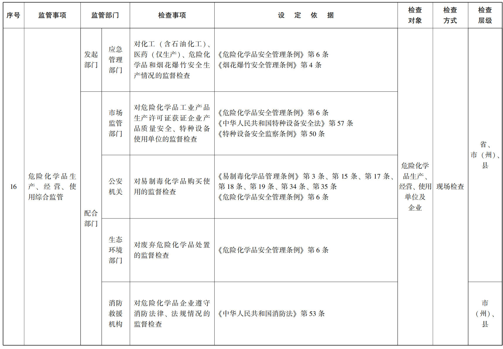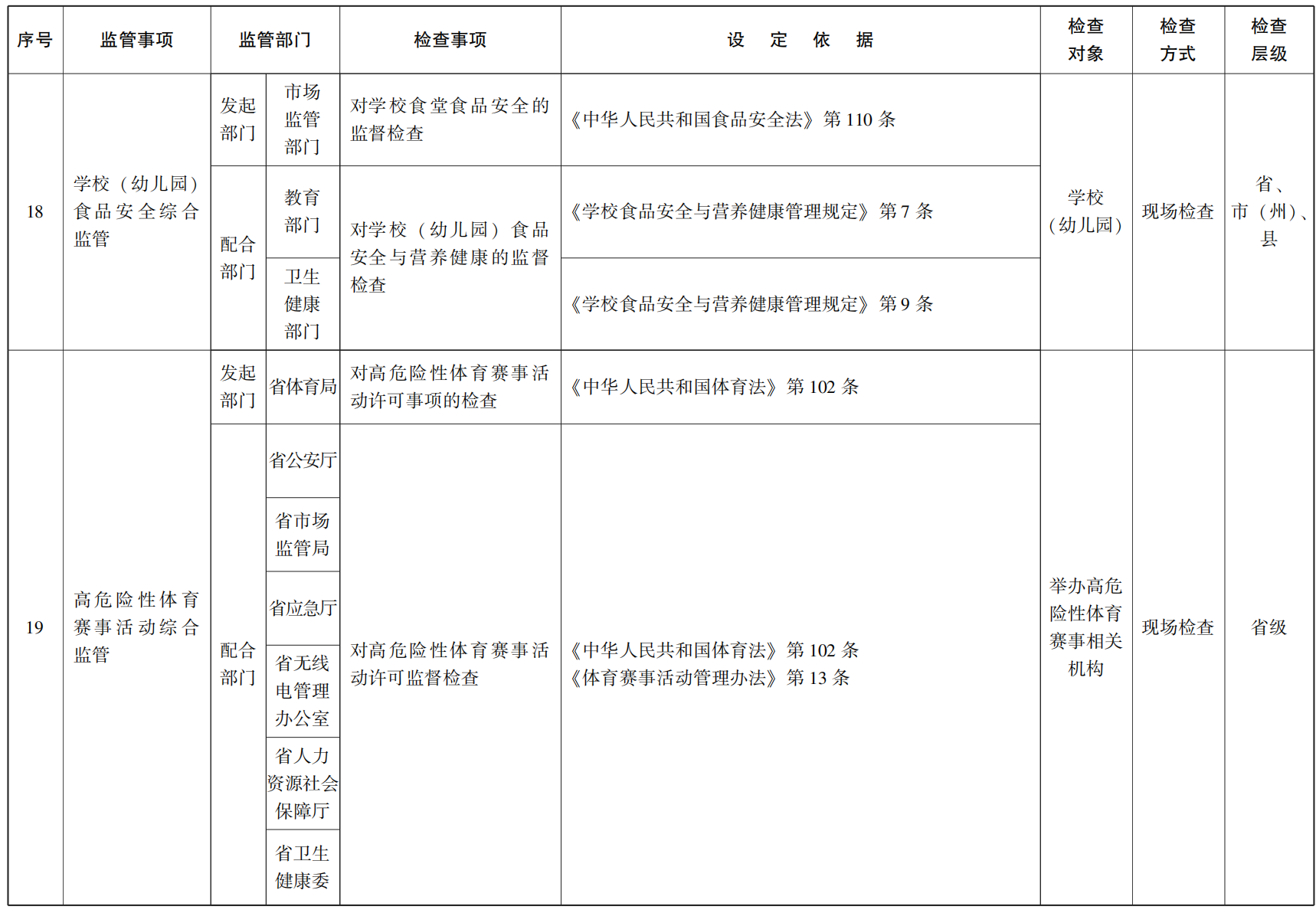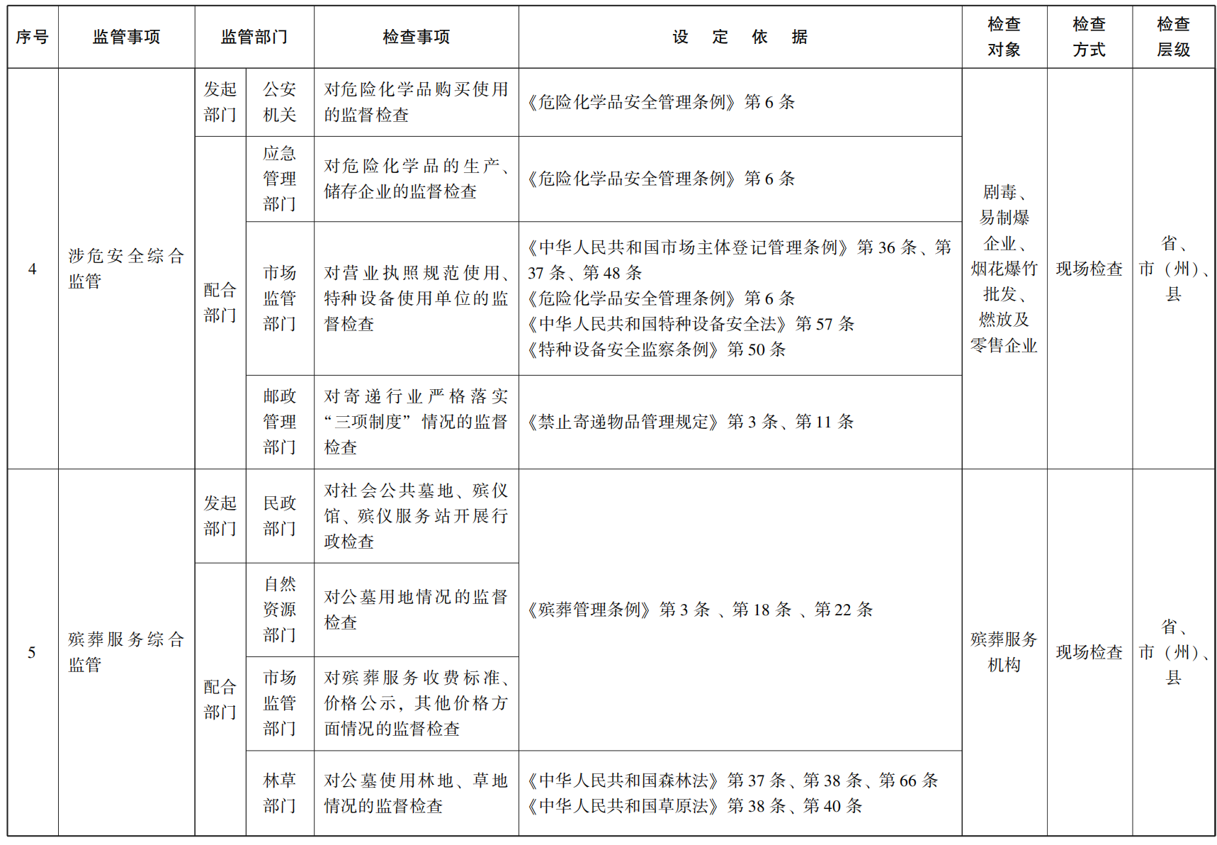 在部分领域,对涉及多个部门、管理难度大、风险隐患突出的监管事项,按省、市(州)、县三级分事项编制公布跨部门综合监管重点事项清单。对纳入清单的事项,由行业主管部门牵头、相关部门参与,建立综合监管工作机制,统筹制定综合监管工作计划,统一组织实施。省政府办公厅牵头编制了《青海省跨部门综合监管重点事项指导清单》(以下简称《指导清单》,详见附件1),省级有关部门(单位)要严格依据《指导清单》组织并指导各地开展跨部门综合监管。各市(州)、县(市、区、行委)要对照《指导清单》,结合本地实际,于2023年9月底前在食品、药品、医疗器械、危险化学品、燃气、特种设备、建筑工程质量、非法金融活动等传统产业领域和新兴行业领域编制公布《××市(州)、县(市、区、行委)跨部门综合监管重点事项实施清单》(以下简称《实施清单》,详见附件2),并依据《实施清单》开展跨部门综合监管。2023年12月底前,省、市(州)、县(市、区、行委)通过“互联网+监管”系统对跨部门综合监管重点事项实施清单管理和动态更新。