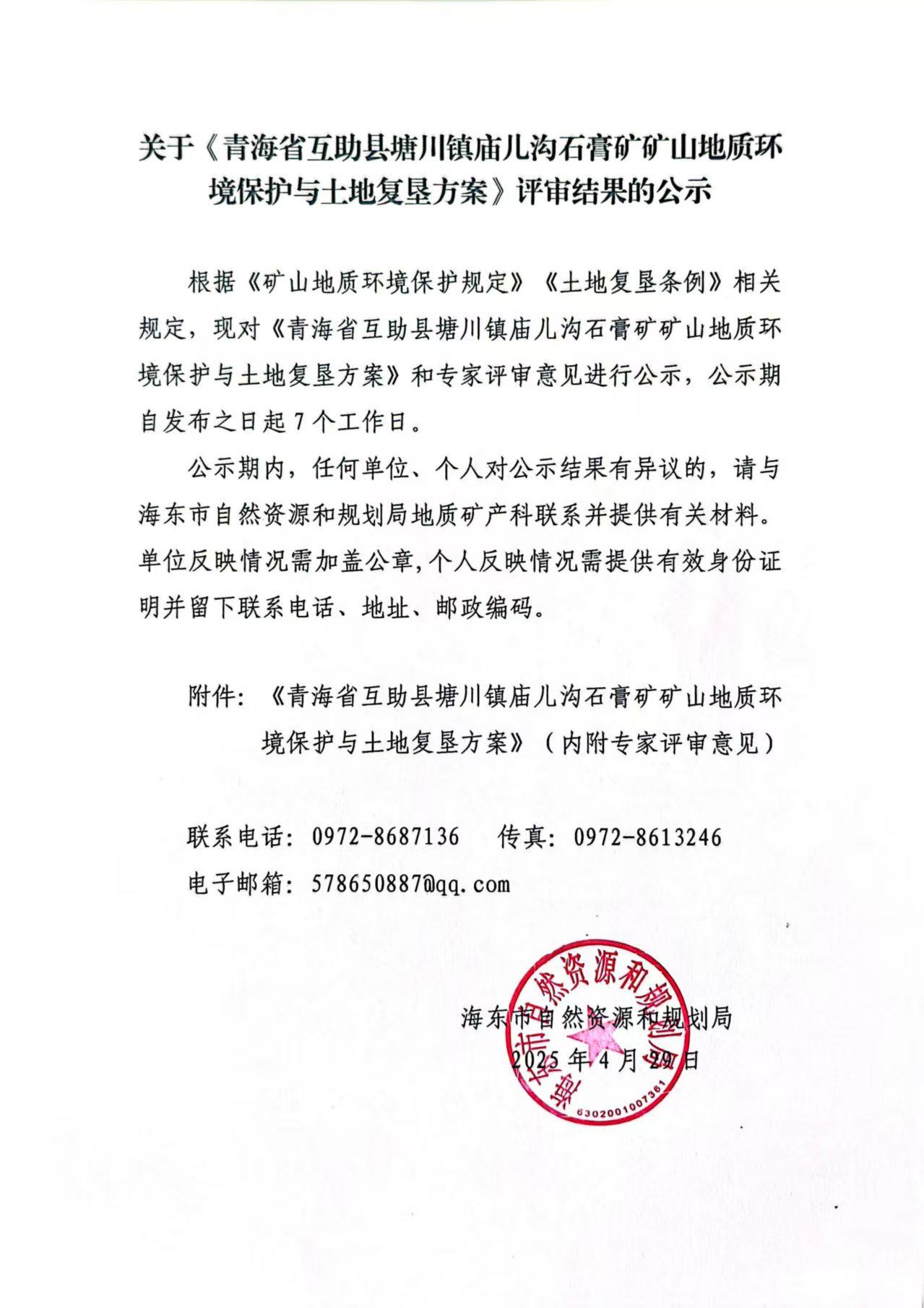 【市自然资源和规划局】关于《青海省互助县塘川镇庙儿沟石膏矿矿山地质环境保护与土地复垦方案》评审结果的公示