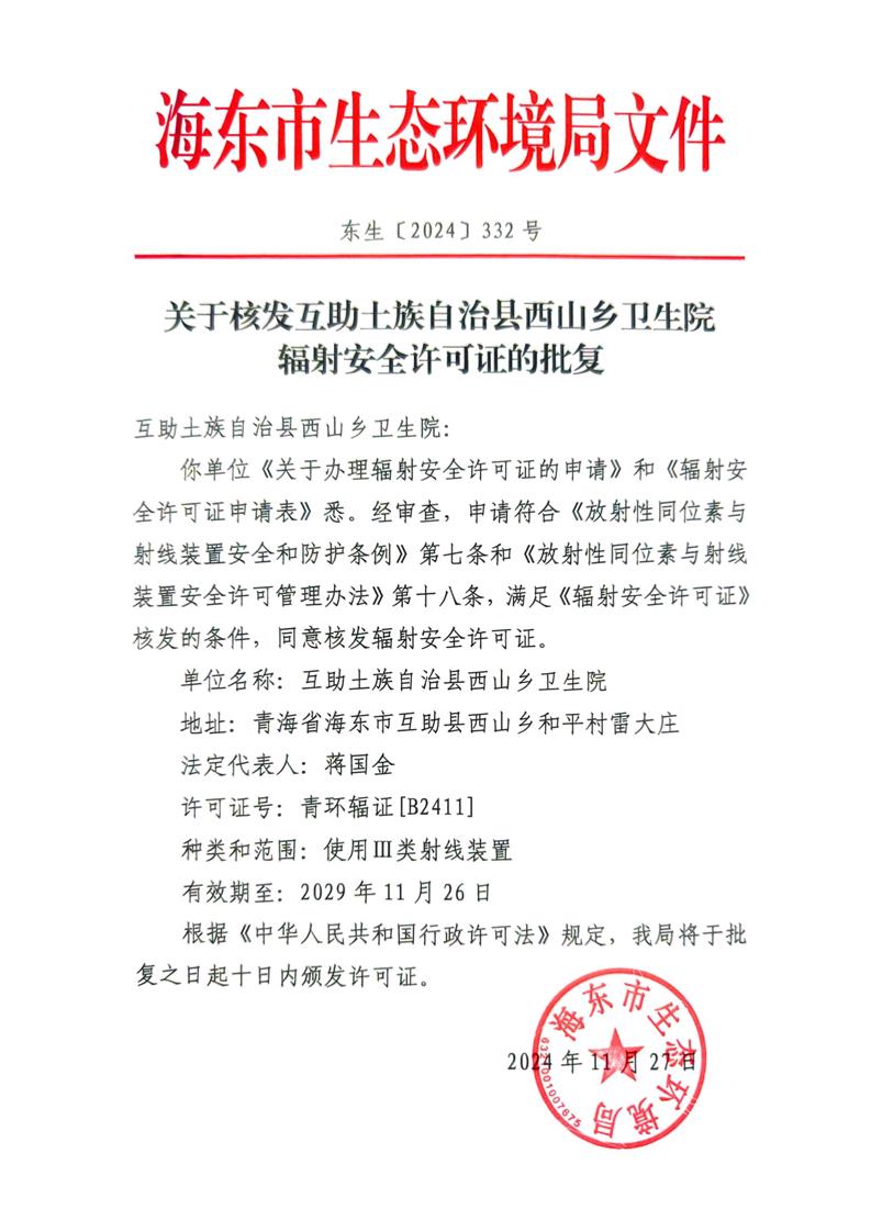 【市生态环境局】关于核发互助土族自治县西山乡卫生院辐射安全许可证的批复