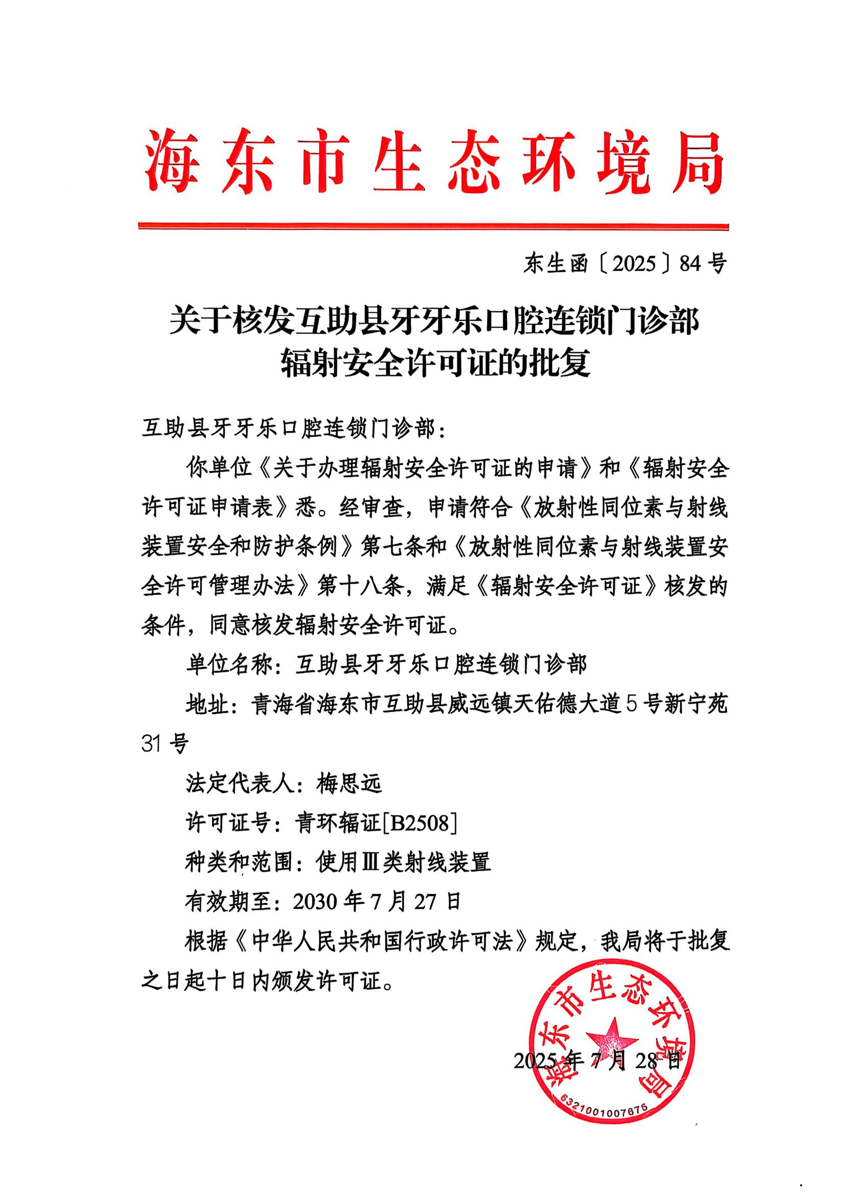 【市生态环境局】关于核发互助县牙牙乐口腔连锁门诊部辐射安全许可证的批复