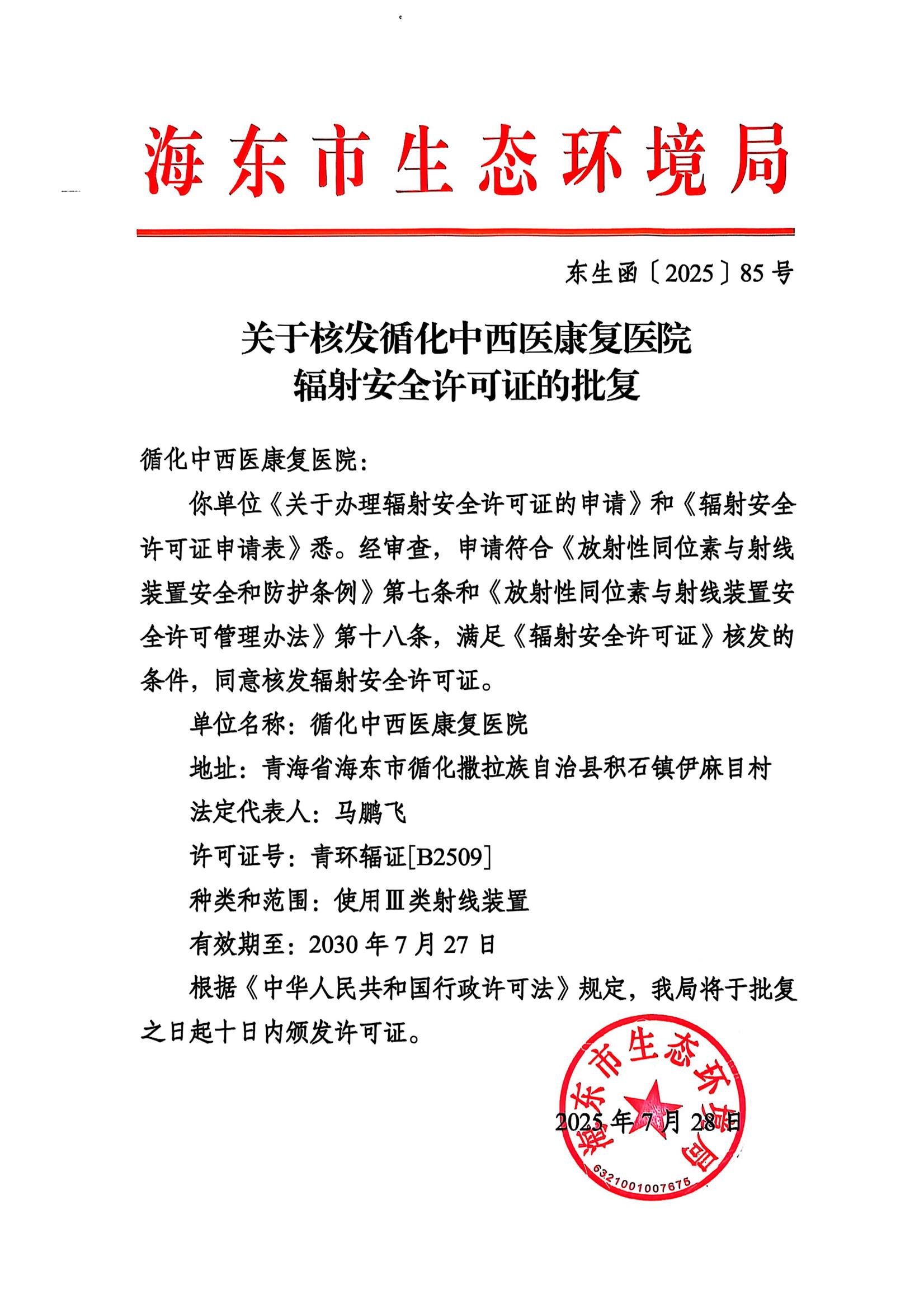 【市生态环境局】关于核发循化中西医康复医院辐射安全许可证的批复