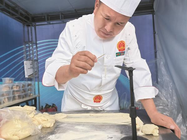 这位正在“穿针引线”的师傅就是青海省拉面行业唯一获得全国五一劳动奖章殊荣的拉面人韩玉龙。在本次的比赛现场,主办方也专门为韩玉龙设置了高原工匠展区,他精湛的技术引得现场观众连连惊叹。