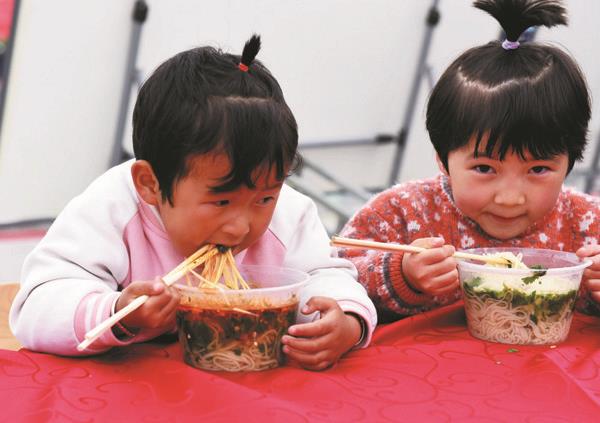 现场,记者的眼光被一处特别的摊位所吸引,竟然有人在比赛场上悠闲地“穿针引线”。记者走近一看, 才发现这针是普通的针,“线”却是一根根细如毛发的面条。