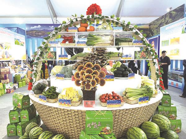 ▲图为民和县展馆展出的农特产品。 海东日报记者 陶成录 摄
