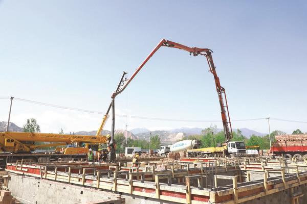 晚上9时许,走进民和县中川乡金田村、草滩村地震灾害避让搬迁安置项目建筑工地,这里灯火闪烁,机械轰鸣,人影晃动,满眼一派热火朝天的繁忙景象。照明灯下,两台伸着长臂的混凝土泵车开足马力浇筑作业,一个个砌筑班组抹浆砌墙干劲十足。