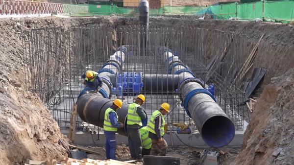 施工现场,3台25吨吊车伸展钢铁臂膀,将管材精准投放到预定位置。技术员实时检测着管道压力测试数据。“每段管道安装后都要进行1.25倍工作压力的水压试验,就像给血管做‘体检’。”技术员说话时,安全绳在腰间晃动着,身后是绵延的输水管线,在春阳下泛着银光。