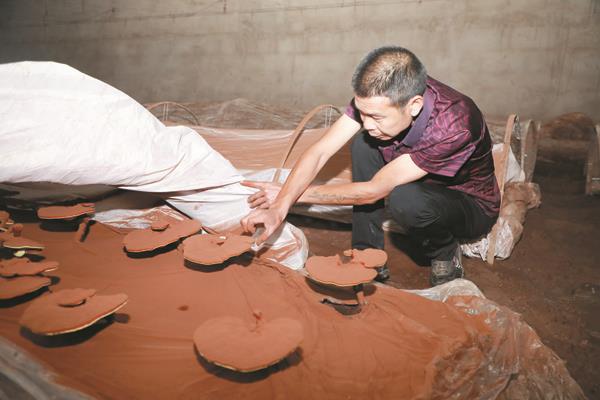 张先平仔细打量着畦床上的一朵朵灵芝,眼神里流露着对灵芝长势的看好。张先平告诉记者,今年民和三川地区气温相对较高,灵芝长势好于往年,现在正值喷粉旺季,再过两个月就可以收获了。