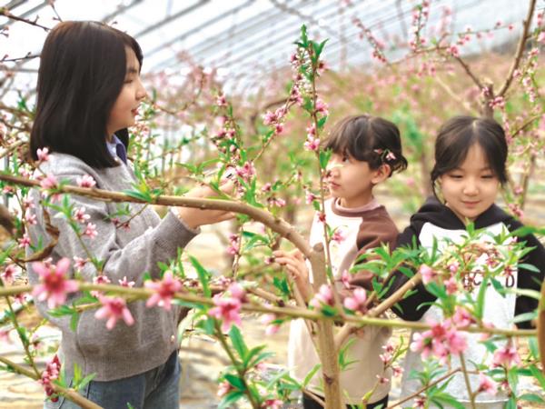 比起棚外万物萧条的场景,油桃棚里春意盎然的景象让不少游客纷至沓来。缀满枝头的桃花向人们传递着春的气息,也预示着即将到来的丰收季。眼下正值桃树管理的关键时期,花丛里忙碌的车武斌正在为桃树疏花、掐枝打叶,做着授粉和通风工作,为今年的稳产增收忙碌着。