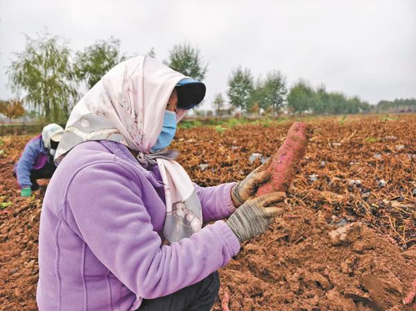 走进大峡村红薯地头,挖薯机缓缓驶过,一个个鲜红圆润、体态饱满的红薯露出地面,很快便摆满了田间地垄。村民们正奋力挥动手中的锄头,不时弯下腰,从土里提出一串串圆滚滚、身披红衣的红薯团子……村民们将红薯表面的泥土清除,并按照大小挑拣分选,然后进行装筐、装车,忙碌的身影与累累硕果交相辉映,呈现出一派热火朝天的丰收景象。“你们带回去尝尝,没想到红薯长这么好,吃起来又甜又糯。”村民热情地递过来几个红薯说。