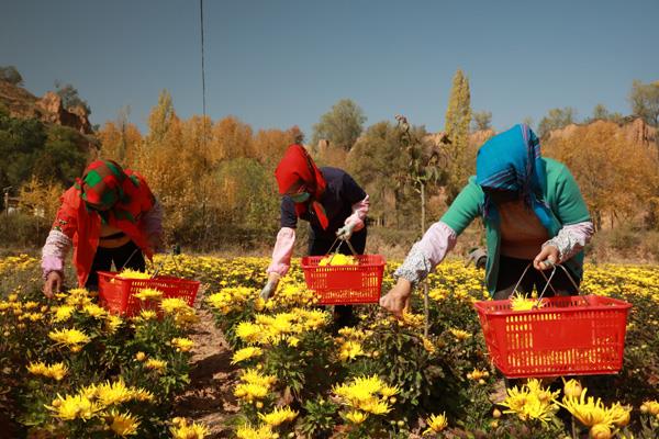 有了“桃梨花谷”的构想,2020年,民主村党支部书记乔维栋带头发起成立了村集体经济发展合作社,通过合作社依托国家村集体经济发展项目扶持,在“花”上做文章,率先试种的70亩金丝皇菊喜获丰收。